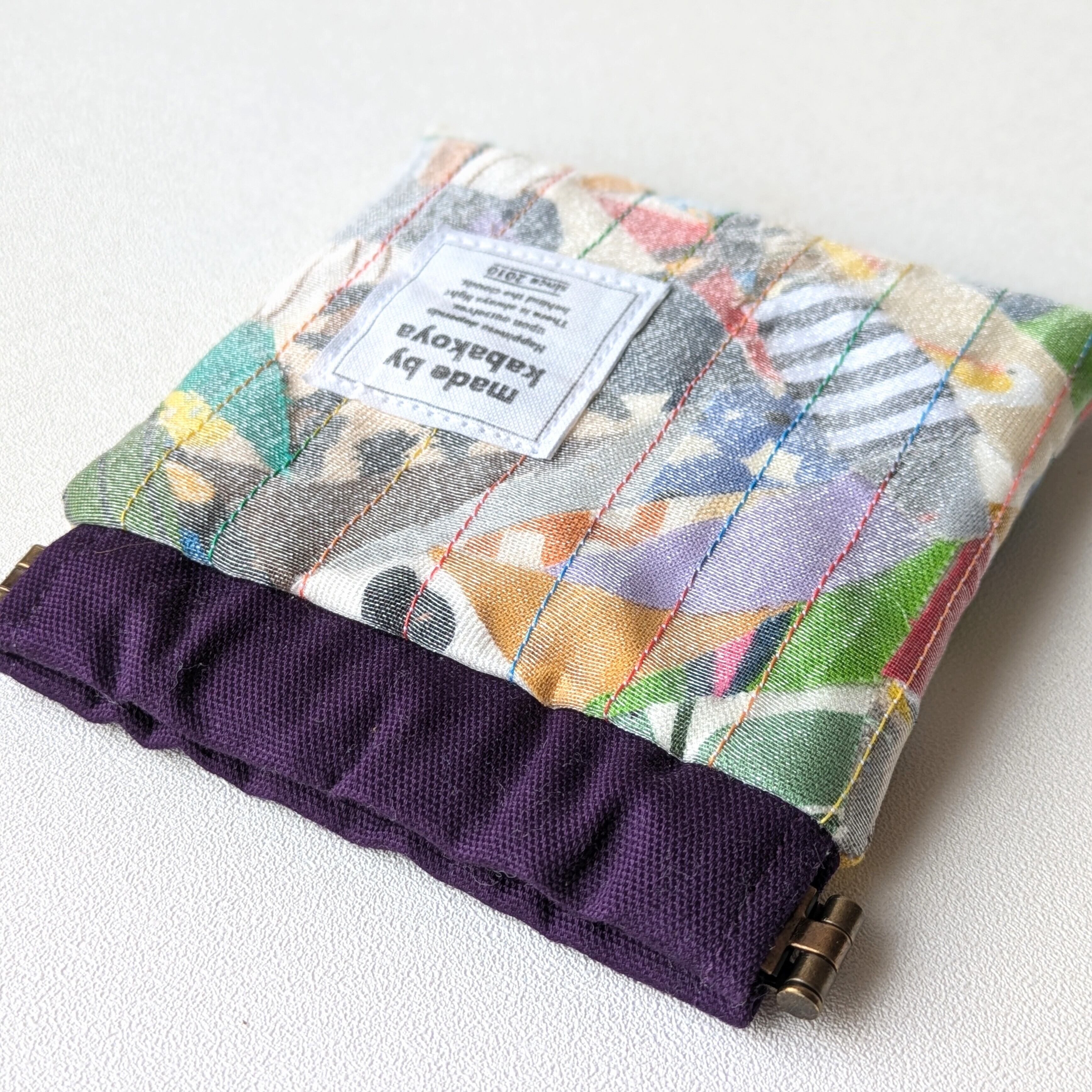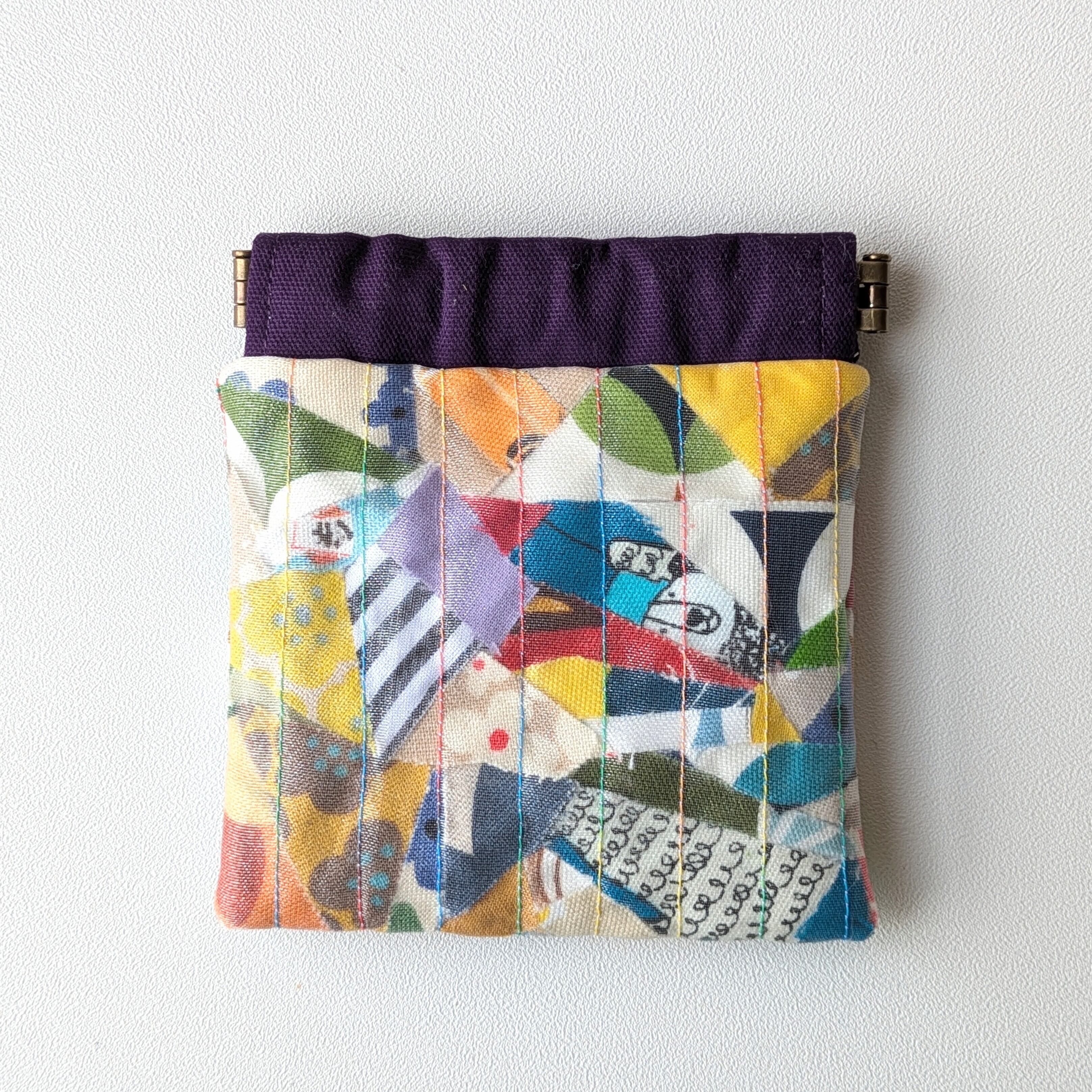 ポーチやバッグを作る時に出る布くずや小さなはぎれを接着芯にアイロン接着していき、上からオーガンジー生地を重ねてミシンステッチをかけて一枚の布のようにアップサイクルしたものをポーチに仕立てました。