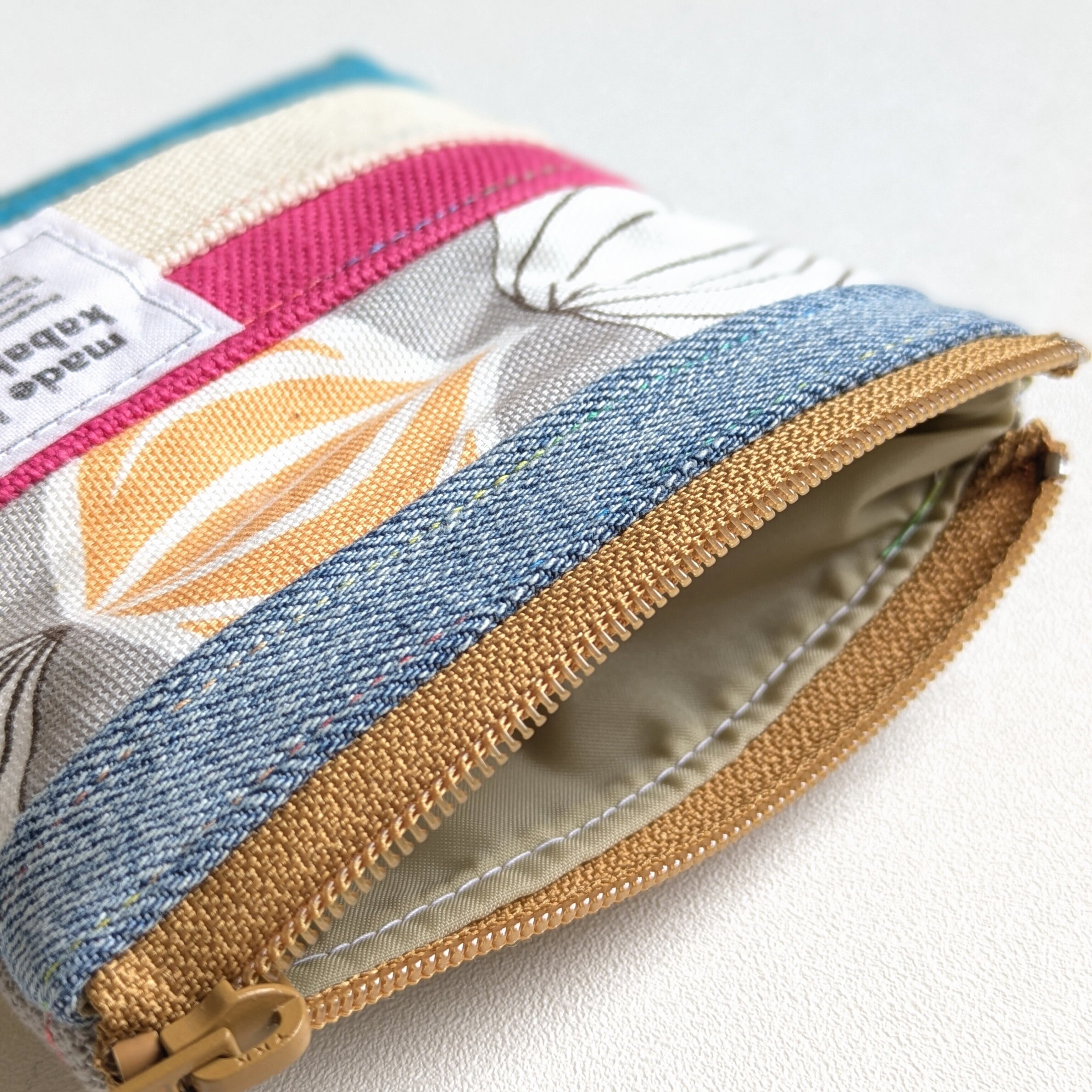 このポーチは、ショルダーやサコッシュ、ポーチなどをを作るときに出る柄物生地や帆布、デニムの『はぎれ』を活用しています。