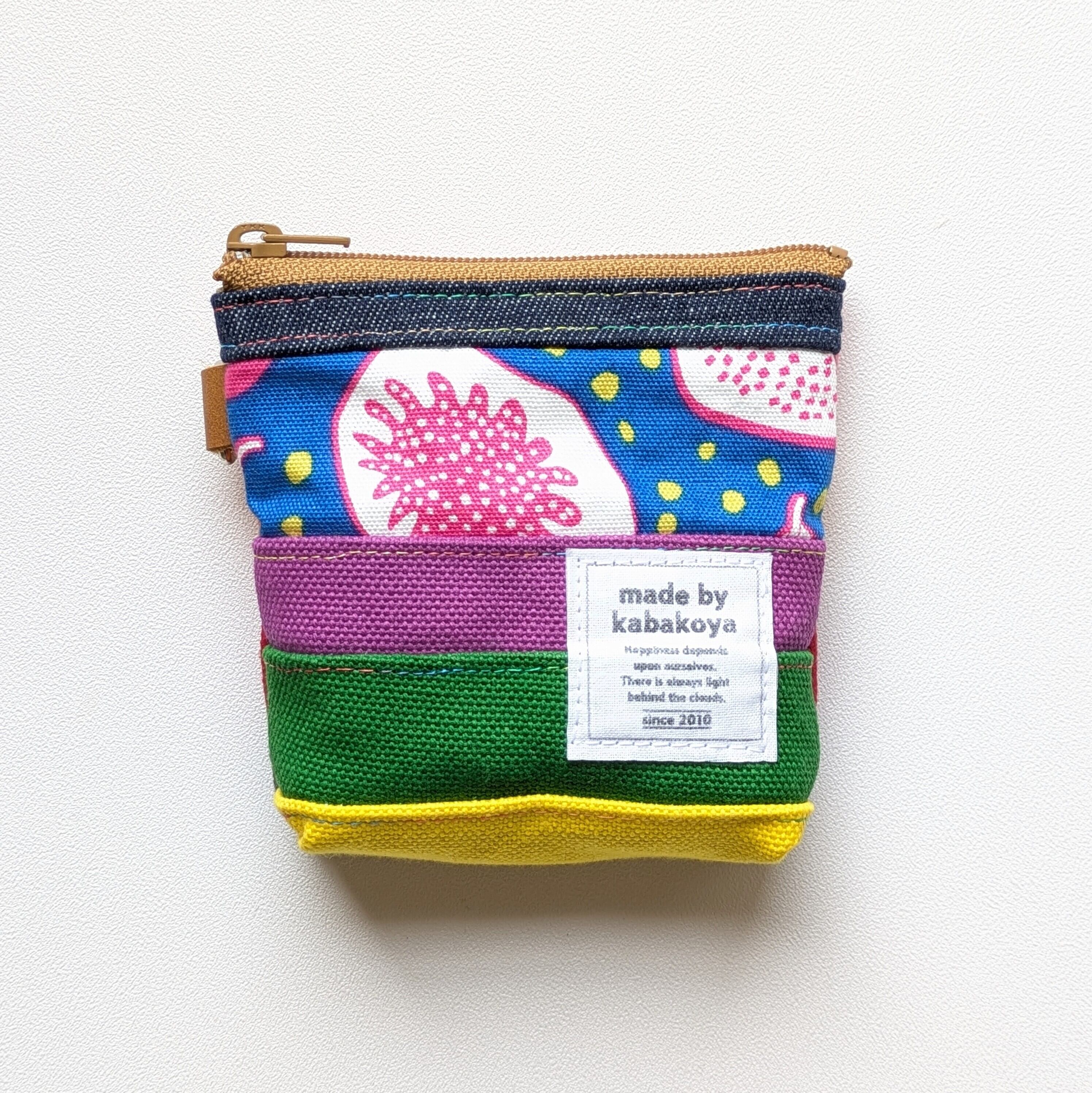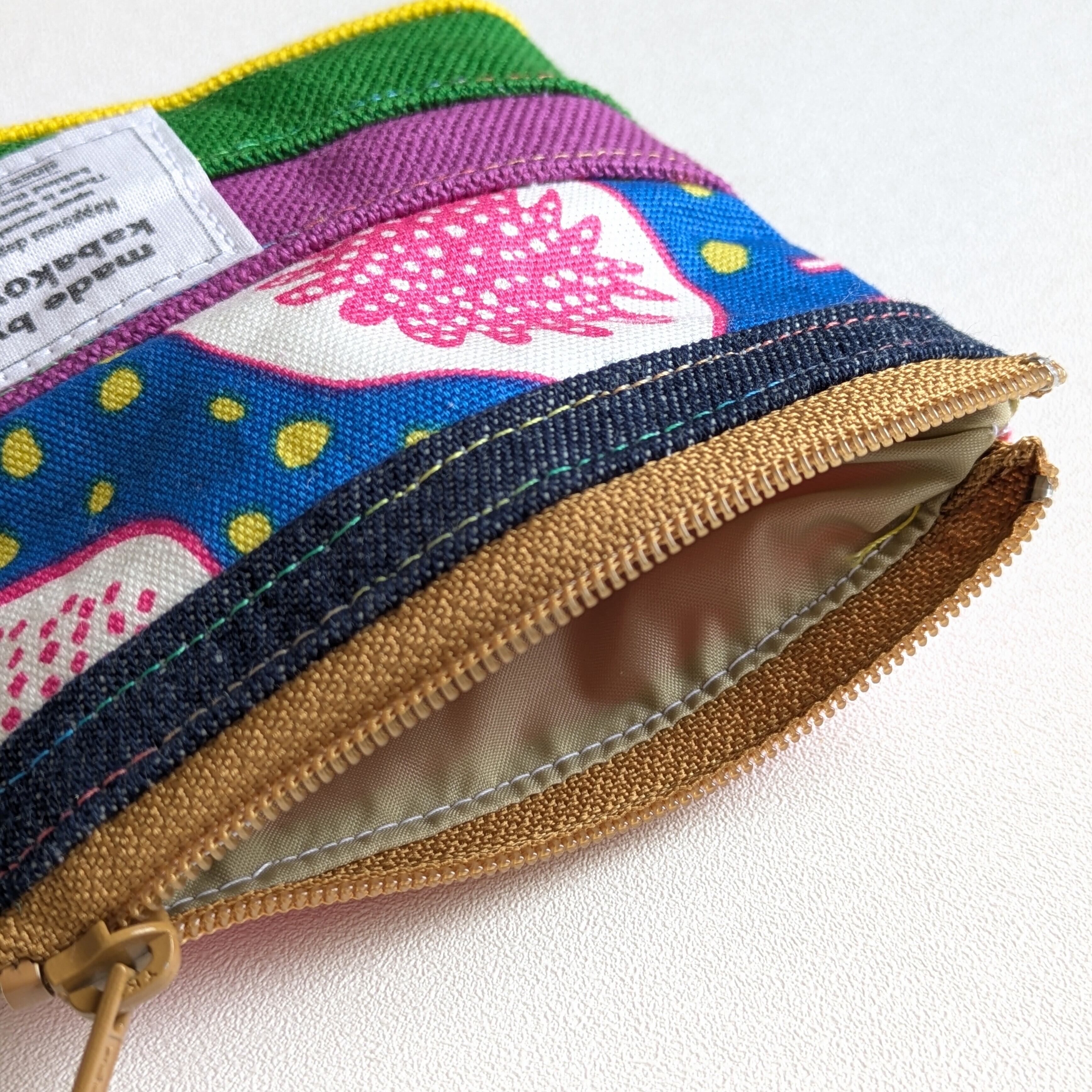 このポーチは、ショルダーやサコッシュ、ポーチなどをを作るときに出る柄物生地や帆布、デニムの『はぎれ』を活用しています。