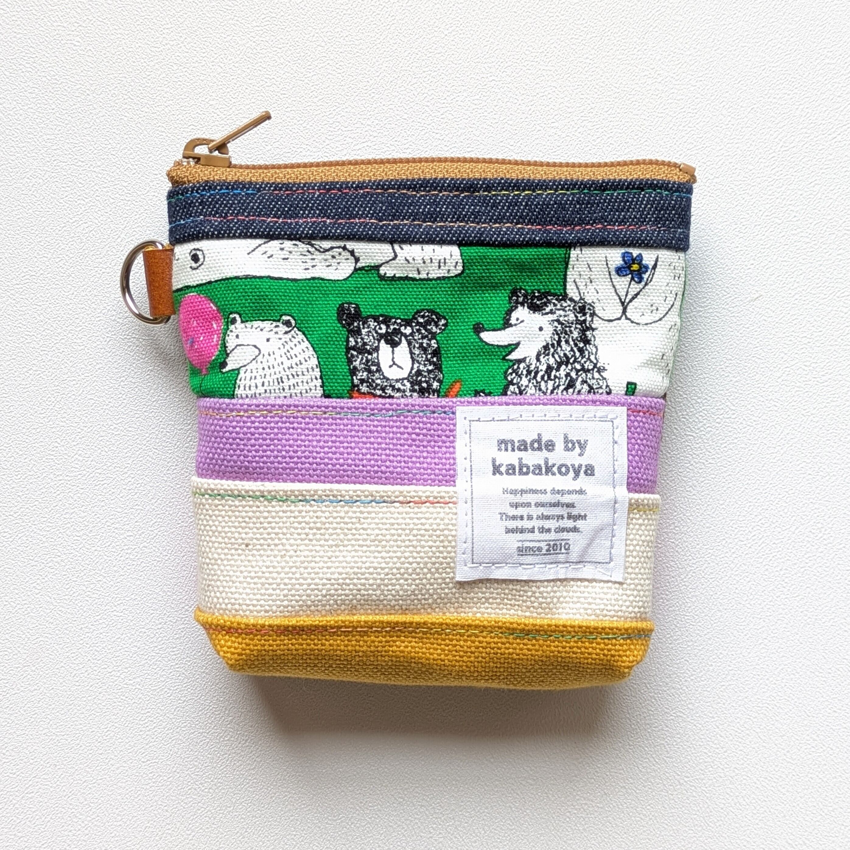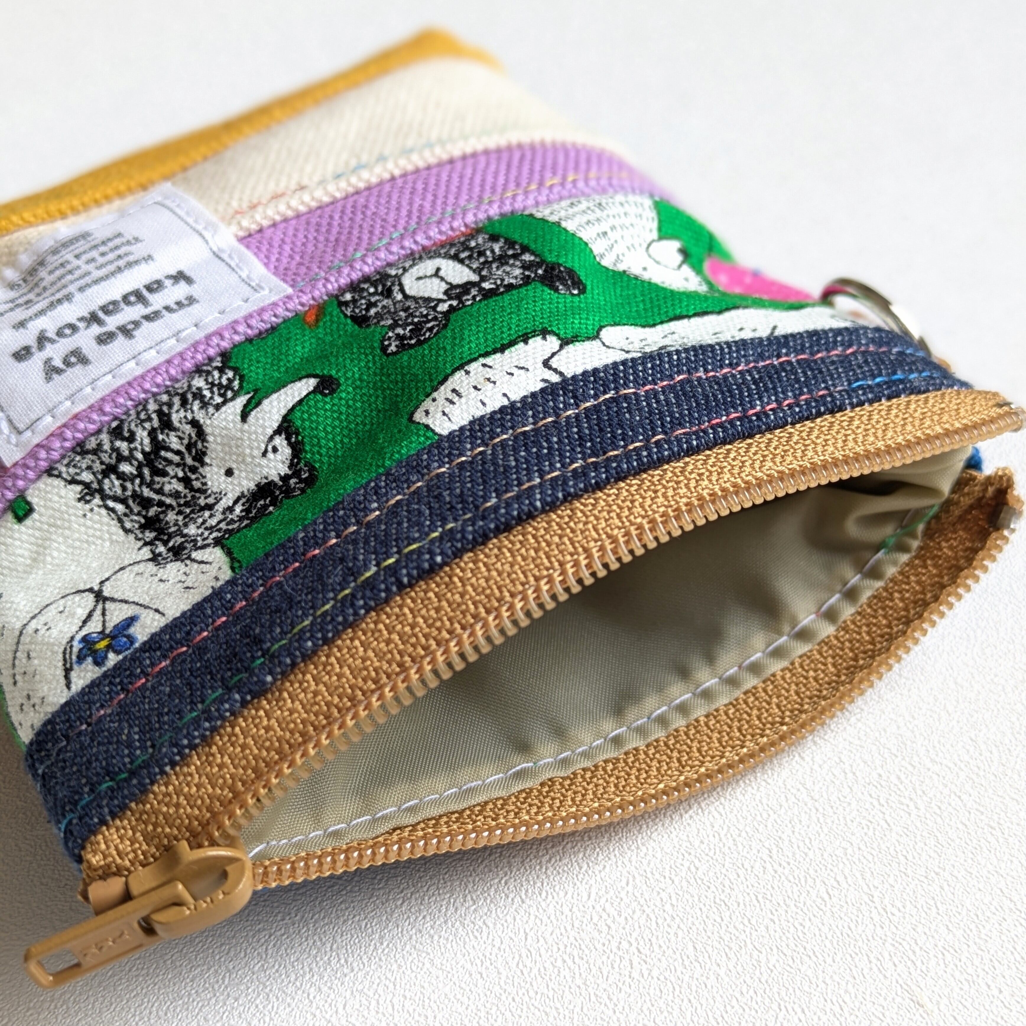 このポーチは、ショルダーやサコッシュ、ポーチなどをを作るときに出る柄物生地や帆布、デニムの『はぎれ』を活用しています。