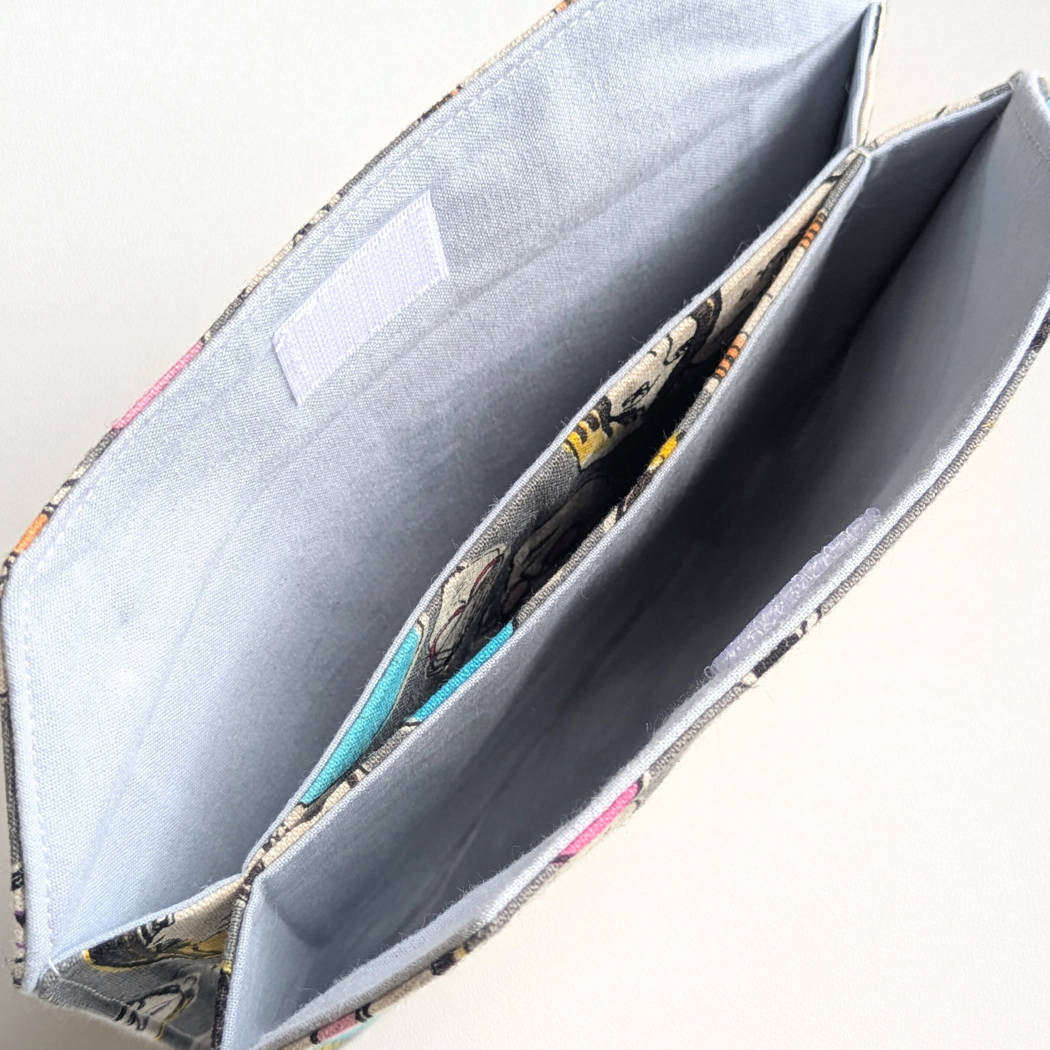 内側は3つのポケットに分かれていて、両サイドのポケットは幅約19cm、真ん中のポケットは幅約14cmです。