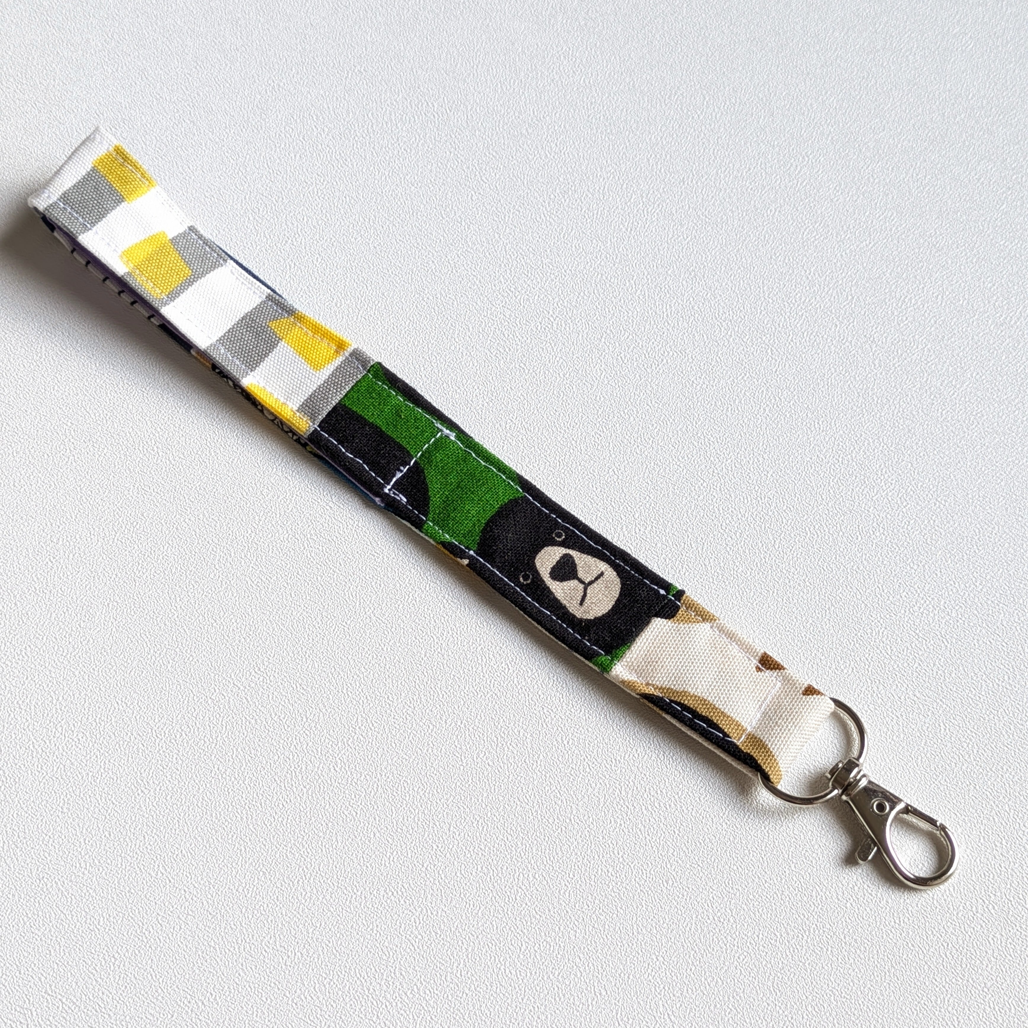 ポーチなどを作った時に出る、細長いはぎれをつなげて作ったカラフルな布製ストラップです。