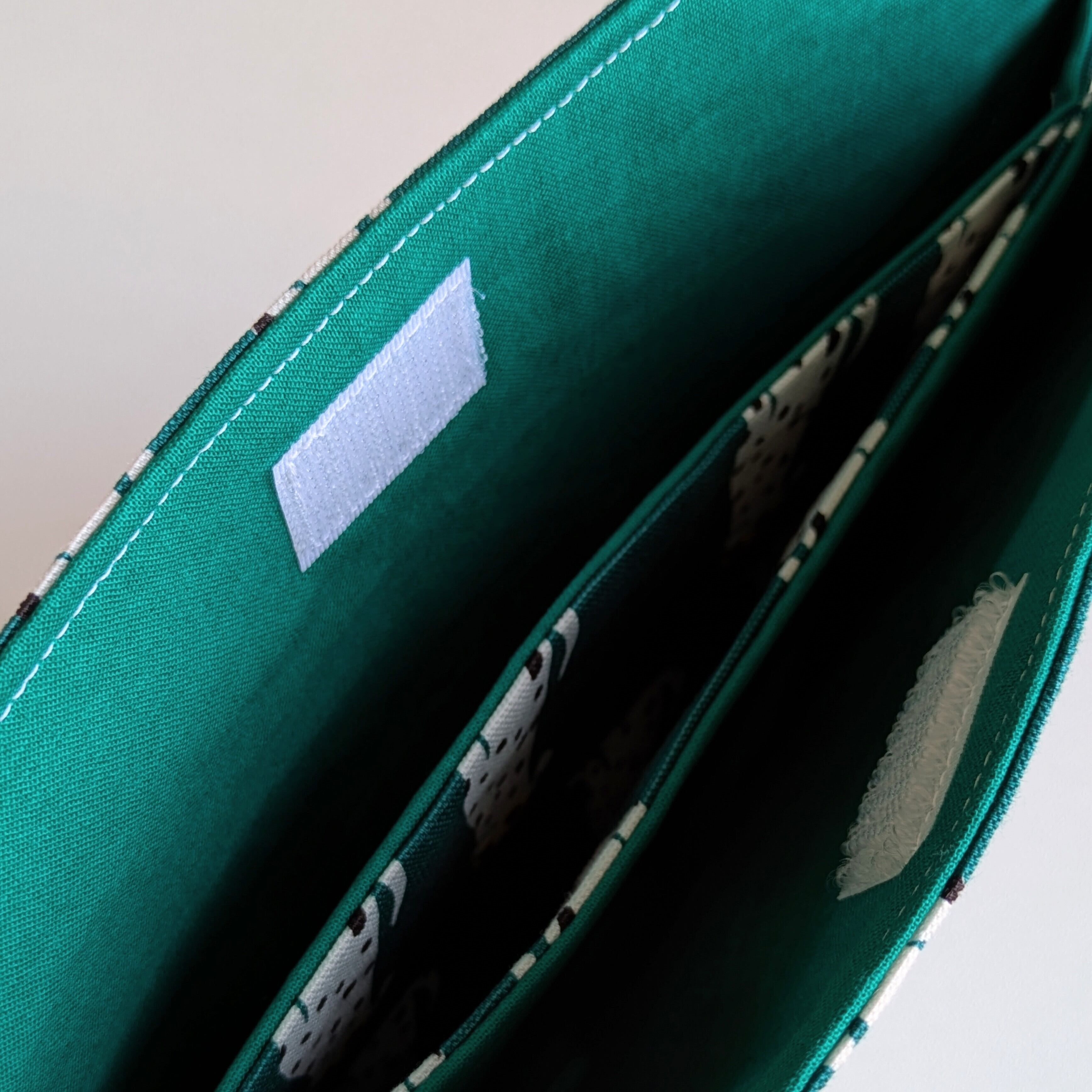 内側は3つのポケットに分かれていて、両サイドのポケットは幅約23cm、真ん中のポケットは幅約18cmです。