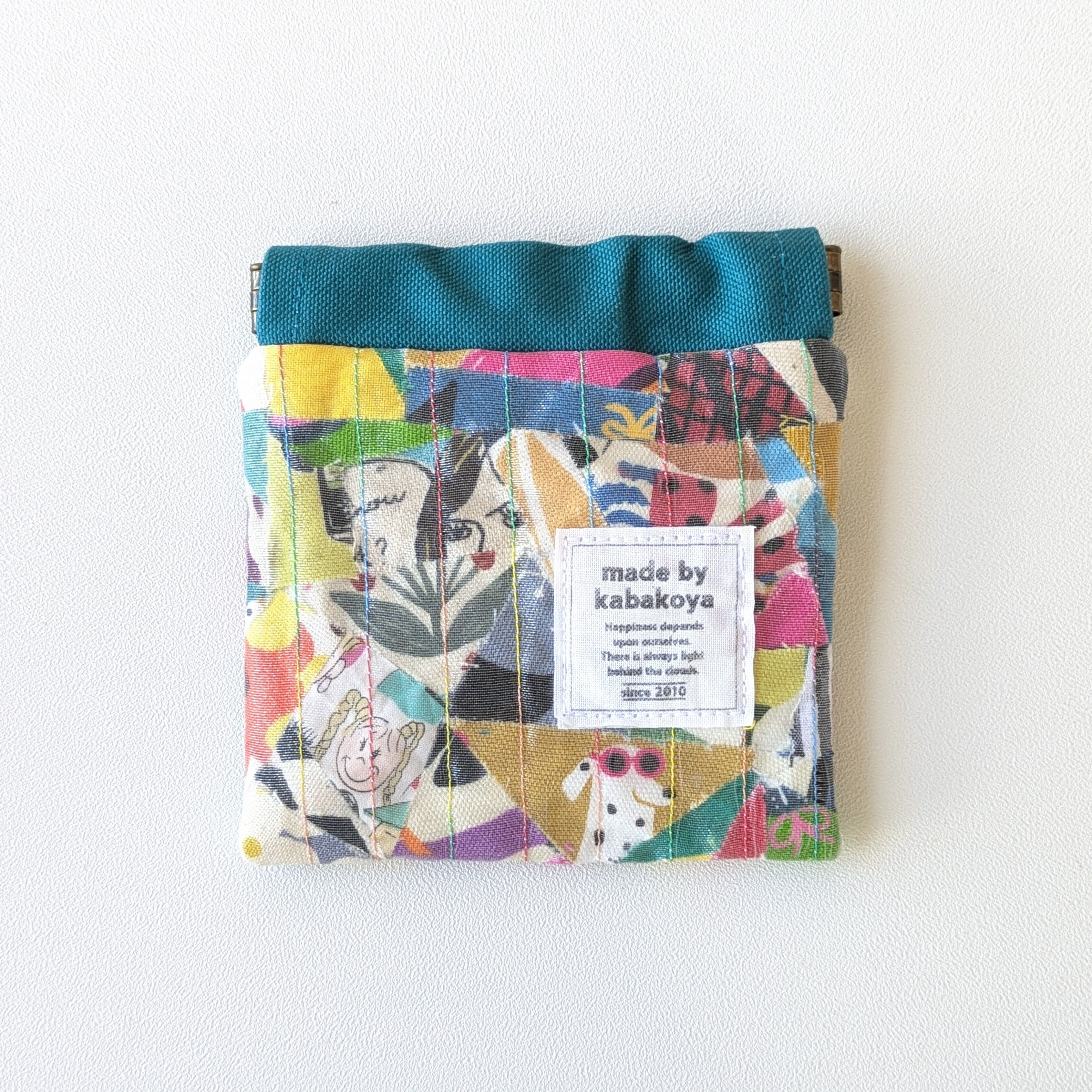 ポーチやバッグを作る時に出る布くずや小さなはぎれを接着芯にアイロン接着していき、上からオーガンジー生地を重ねてミシンステッチをかけて一枚の布のようにアップサイクルしたものをポーチに仕立てました。