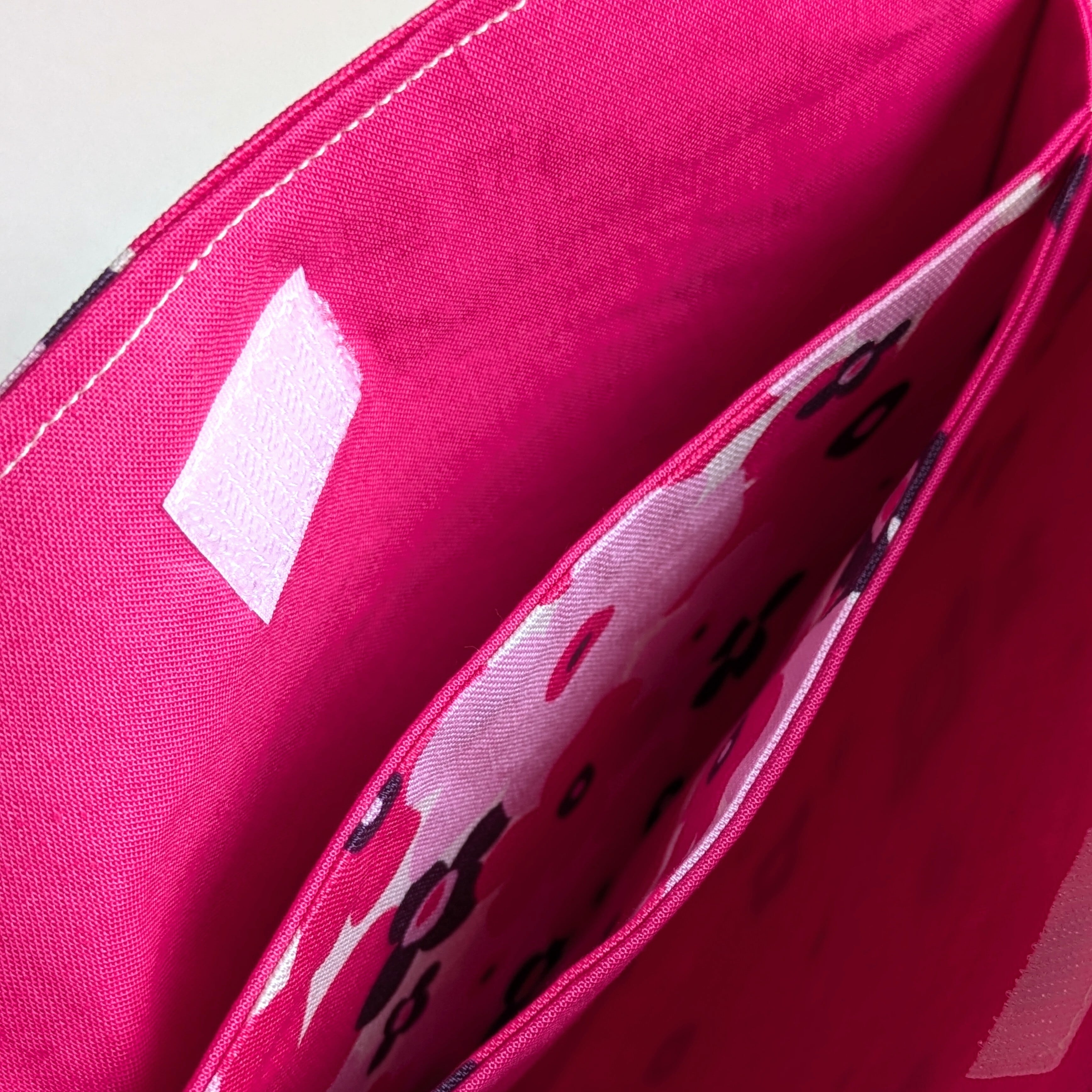 内側は3つのポケットに分かれていて、両サイドのポケットは幅約23cm、真ん中のポケットは幅約18cmです。