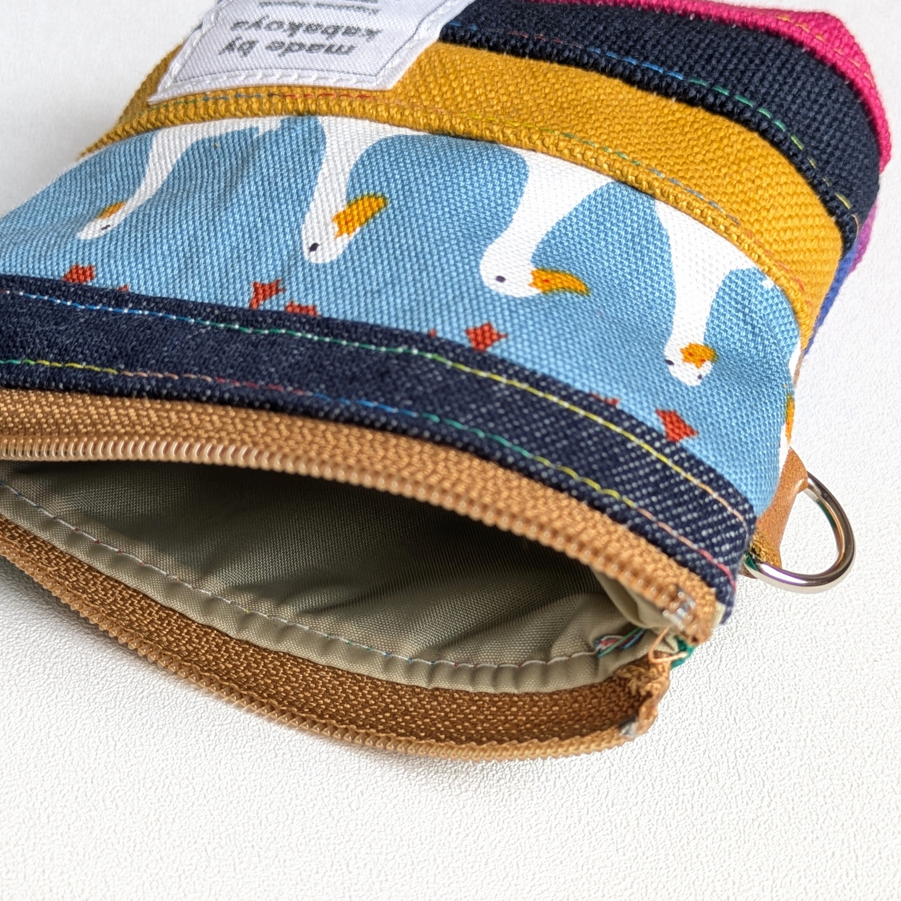 このポーチは、ショルダーやサコッシュ、ポーチなどを作るときに出る柄物生地や帆布、デニムの『はぎれ』を活用しています。