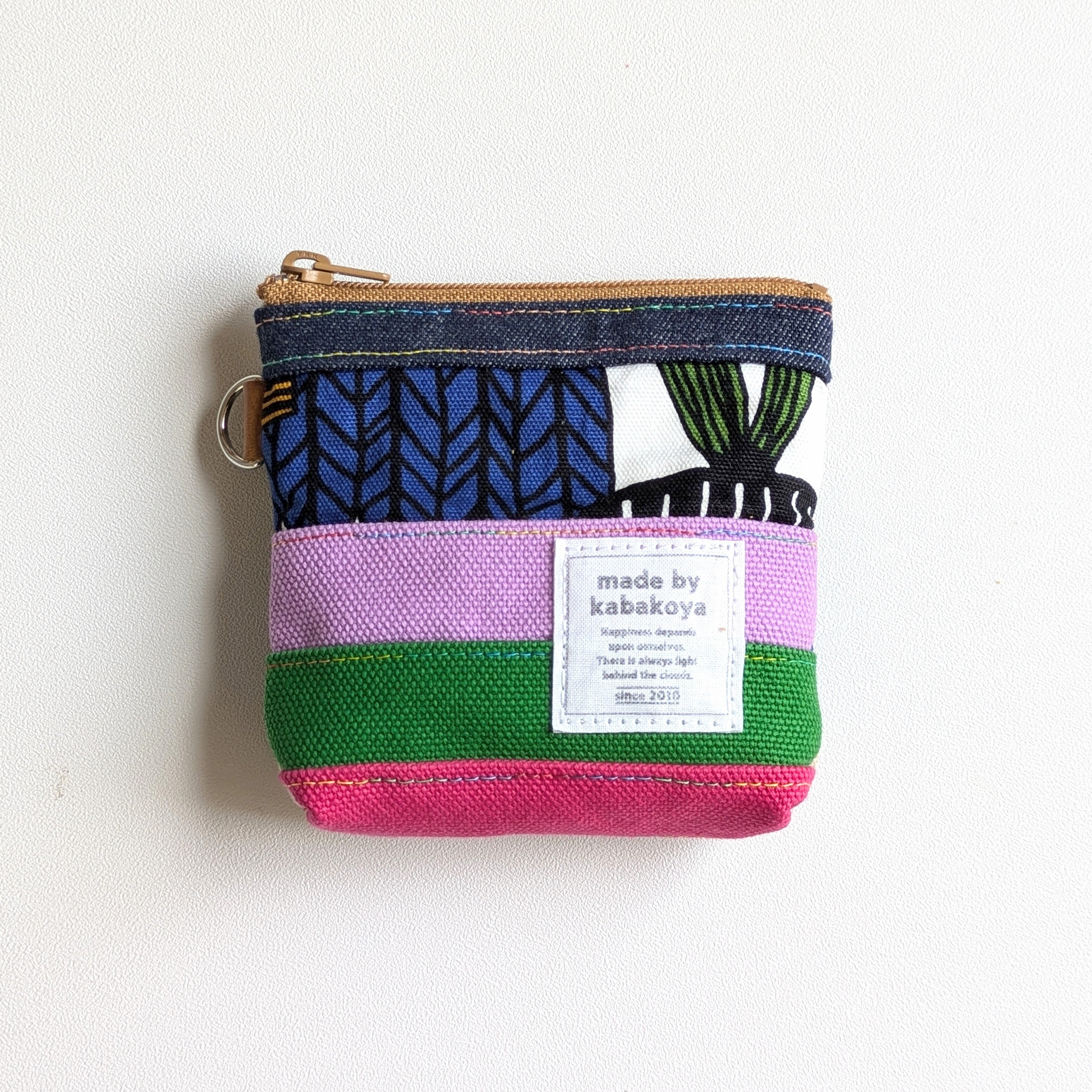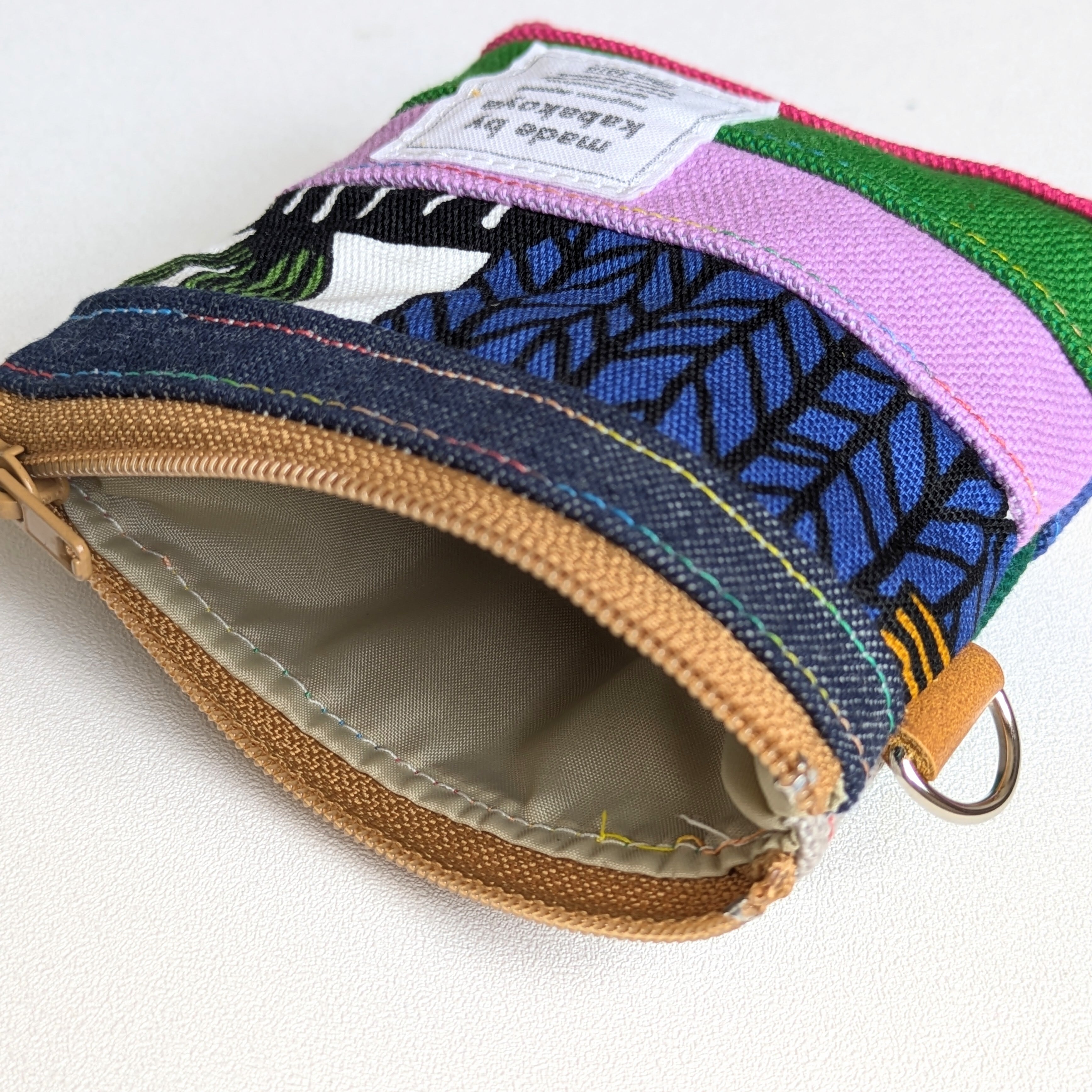 このポーチは、ショルダーやサコッシュ、ポーチなどを作るときに出る柄物生地や帆布、デニムの『はぎれ』を活用しています。